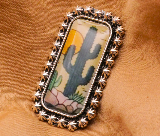 Cactus Sun Landscape Rectangular Silver Metal Button 17x30mm