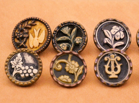 Ivoroid Picture Foliage Flowers Palm Harp Bird Grapes Victorian Celluloid Metal Button 13-15mm