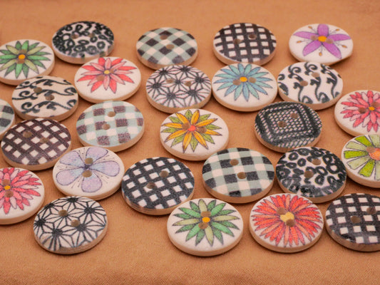 Retro Flower Black White Colorful Wood Set of Thirty Buttons 15mmRegular price $6.00 USDRegular priceUnit price / per-