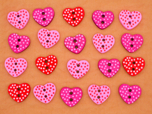Heart Polka Dot Red Pink Wood Set of Twenty Buttons 13x15mm