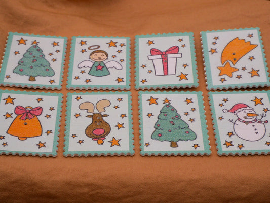 Christmas Stamp Tree Gift Shooting Star Reindeer Mint Green Wood Set of Eight Buttons 30x38mm