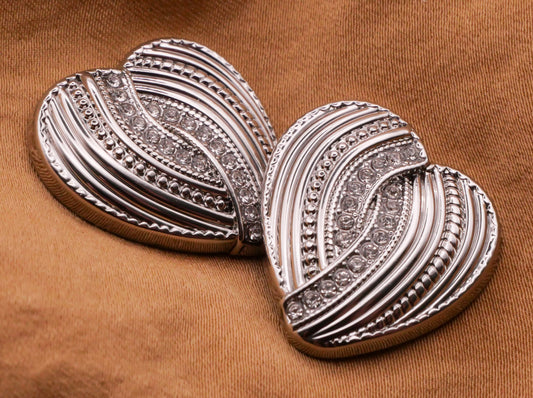 Heart Interlocking Ribbed Rhinestone Silver Metal Button 22mm