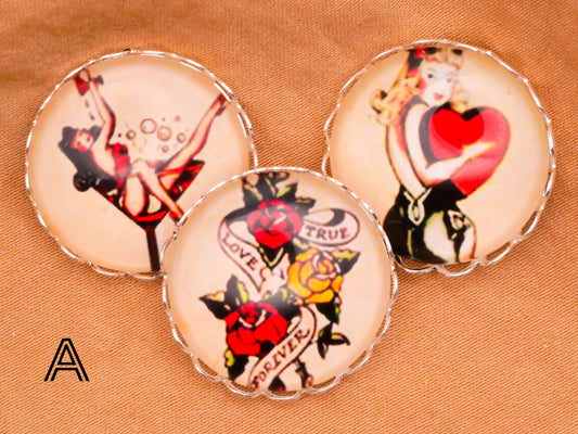 Tattoo Pin Up Girls Nurse Heart Swallows Glass Dome Silver Metal Set of Three Buttons Various 21mm