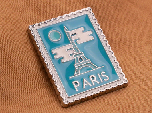 Paris France Eiffel Tower Moon Stamp Turquoise Blue Enamel Silver Metal Button 21x28mm
