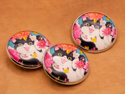 Cat Kitty Butterfly Flowers Colorful Glass Silver Metal Button 27mm