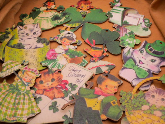 St Patricks Day Vintage Graphics Wood Set of Eleven Ornaments Decorations 52-78mm