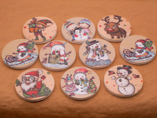 Snowman Reindeer Santa Wood Assorted Set of Ten Buttons 25mm