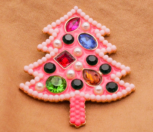 Christmas Tree Pink Pearls Rhinestones Large Metal Button 33x41mm
