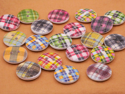Plaid Pink Green Blue Red Wood Set of Twenty Buttons 15mm