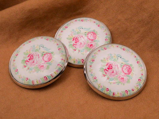 Rose Bush Flowers Blue Bird Glass Dome Metal Button 27mm
