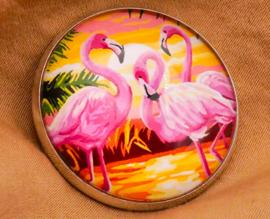 Flamingo Bird Beach Glass Silver Metal Button 27mm