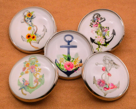 Anchor Flower Design Glass Silver Metal Set of Five Buttons Various 20mm