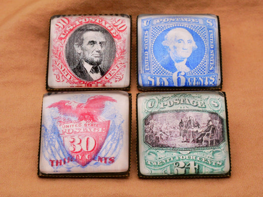 Postage Stamp USA Lincoln Washington Eagle Declaration Square Glass Metal Button Various 26mm