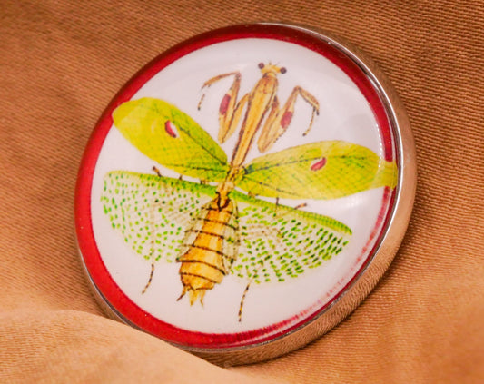 Praying Mantis Insect Green Red Dome Glass Silver Metal Button 27mm
