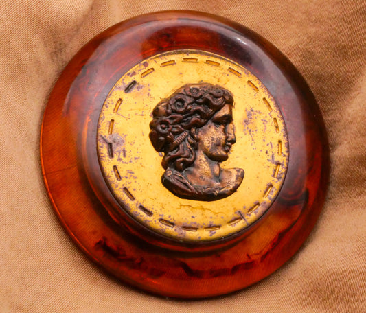 Portrait Lady Metal Center Root Beer Bakelite Early Plastic Large Button 43mm