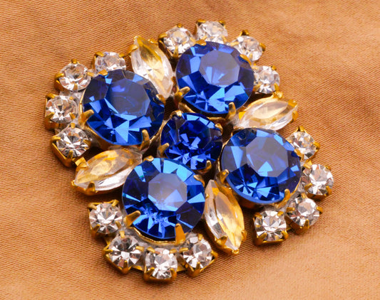 Sapphire Blue Czech Glass Rhinestone Square Large Vintage Metal Button 35mm