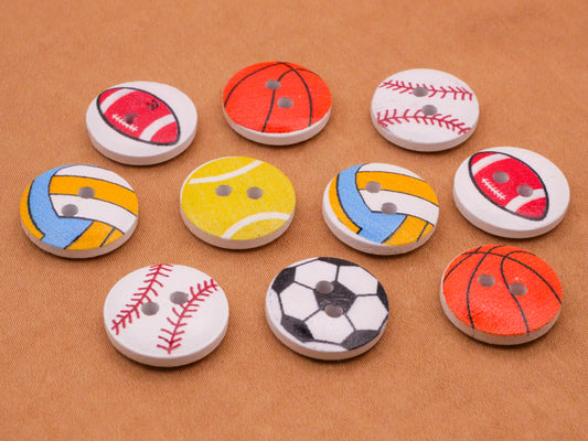 Sports Volleyball Football Soccer Baseball Tennis Basketball Wood Set of Ten Buttons 15mm