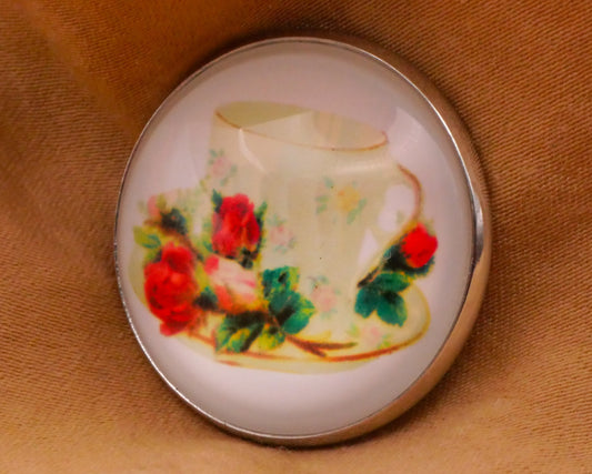 Teacup Red Pink Roses Glass Dome Silver Metal Button 27mm