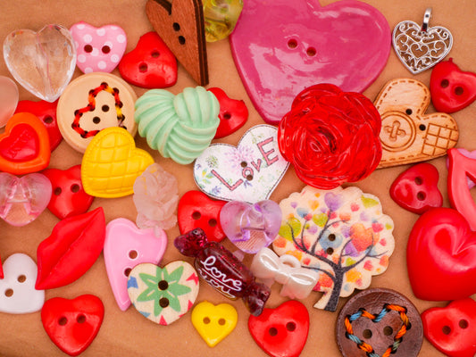 Valentine Heart Grab Bag Plastic Wood Assorted Set of Fifty Plus Buttons 9-31mm