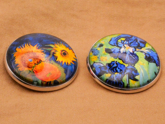 Van Gogh Sunflowers or Irises Glass Dome Silver Metal Button Various 27mm