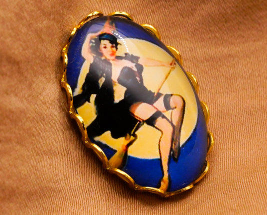 Witch Pin-Up Girl Broomstick Moon Oval Gold Metal Button 19x26mm