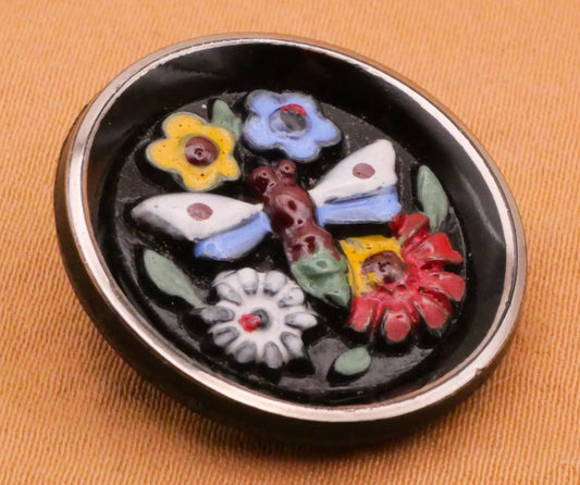 Butterfly Flowers Hand-Painted Black Glass Vintage Button 23mm