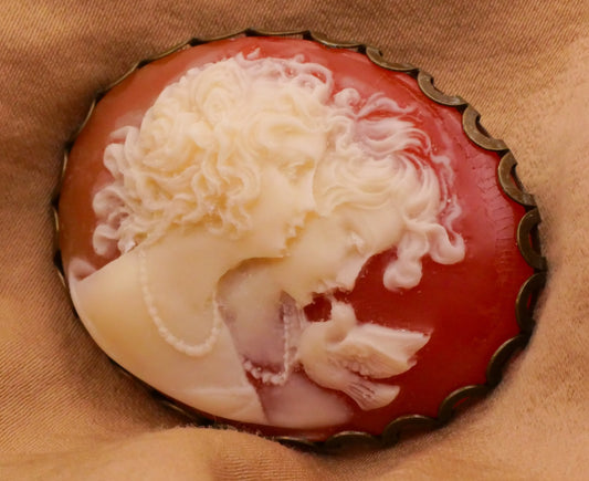 Cameo Ladies Pearl Necklace Bird Coral Ivory Look Resin Bronze Metal Button 31x41mm