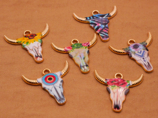 Cattle Cow Skull Roses Designs Metal Set of Six Charms Embellishments Various 22mm