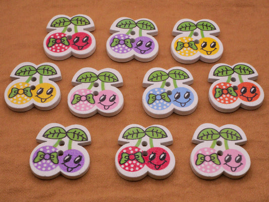 Cherry Cherries Bow Smiley Face Wood Assorted Set of Ten Buttons 20mm