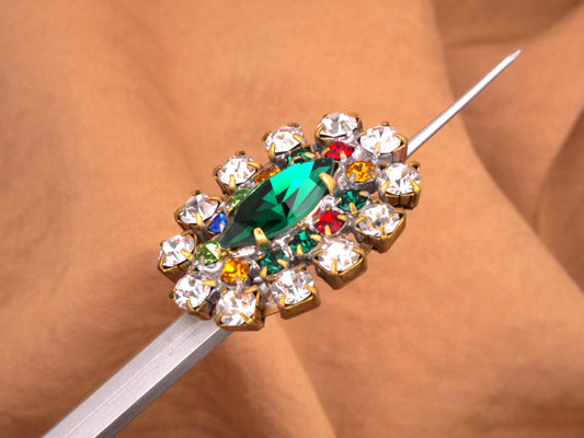 Czech Glass Rhinestone Emerald Marquise Multi-Color Vintage Button 22x30