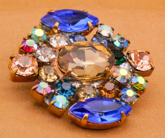 Czech Rhinestone Blue Green Taupe Glass Metal Large Button 34x35mm