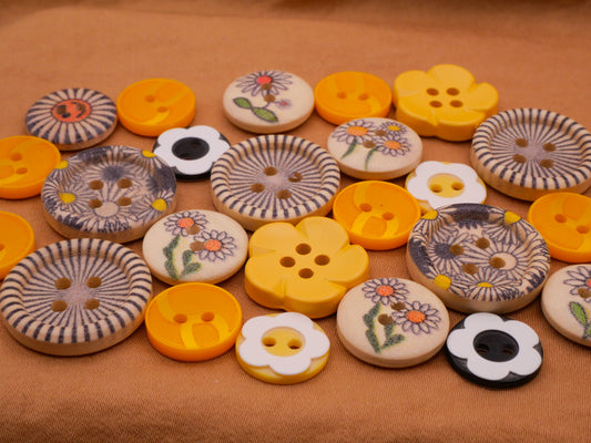 Daisy Flower Yellow Black Wood Plastic Set of Twenty-Four Buttons 13-20mm