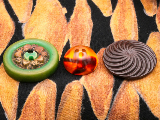 Early Plastic Set of Three Green Wreath Brown Swirl Tigers Eye Half Dome Buttons 18-28mm
