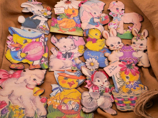 Easter Card Reproductions Wood Set of Twelve Ornaments Decorations 50-83mm