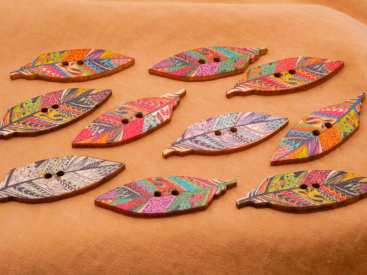 Feather Colorful Pattern Wood Sew-Thru Set of Ten Buttons 15x43mm