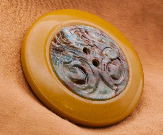 Filigree Medallion Blue Brown Large Celluloid Early Plastic Tight Top Button 38mm