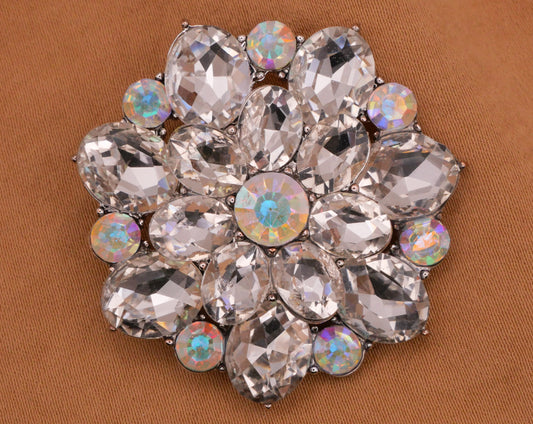 Flower Rhinestone Clear Iridescent Large Silver Metal Button 37mm