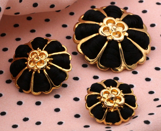 Gold Metal Flower Buttons Black Woven Ribbons Three Sizes Available 9-31mm