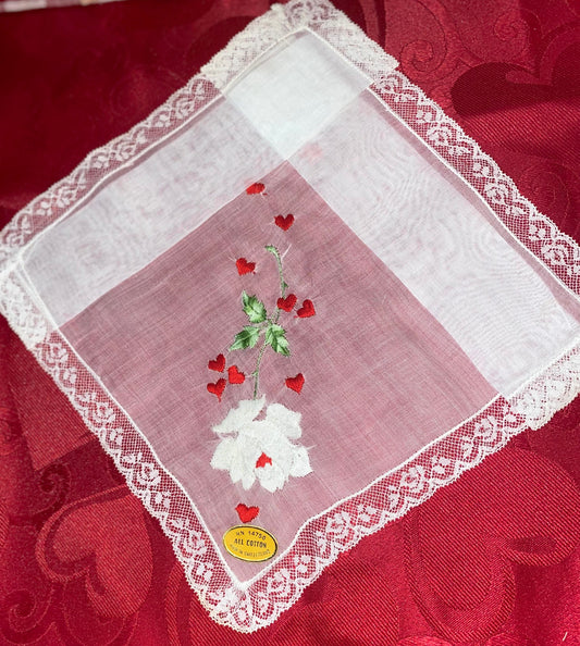 Hankie Embroidered White Rose Hearts Lace Edge Vintage Handkerchief