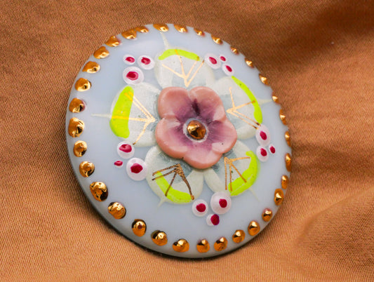 Hand-Painted Flower Czech Pale Blue Glass Pink Green Red Gold Button 36mm
