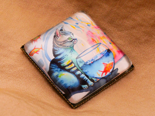 Kitty Cat Goldfish Fish Bowl Watercolor Look Glass Metal Square Button 26mm