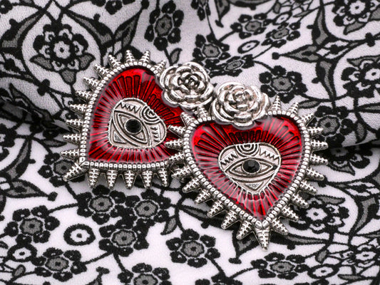 Mexican Inspired Heart Eye Rose Metal Red Resin Button 29x35mm