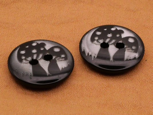 Mushroom Scene Black White Carved Plastic Pair of Buttons 15mm