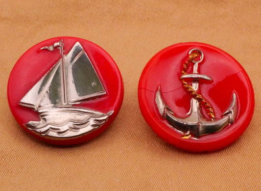 Nautical Sailboat or Anchor Vintage Silver and Red Glass Button Various 18mm