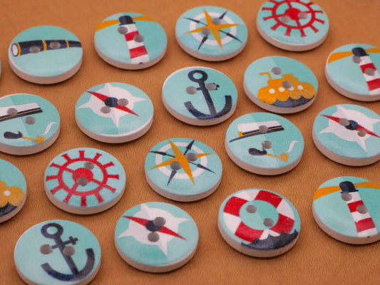 Nautical Blue Boat Sailing Anchor Ship Wheel Wood Set of Twenty Buttons 15mm