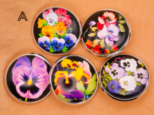 Pansy Colorful Glass Dome Silver Metal Set of Five Buttons Various 20mm