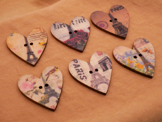 Paris France Eiffel Tower Heart Wood Sew-Thru Button Various 25x28mm