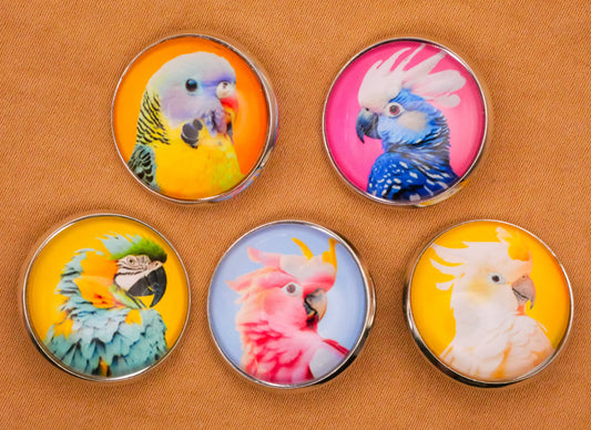 Parrot Tropical Bird Glass Dome Silver Metal Set of Five Buttons 20mm