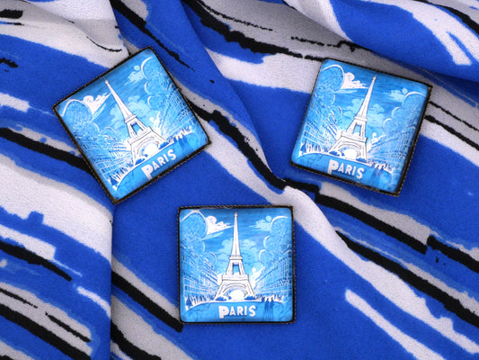 Paris France Eiffel Tower Moon Stamp Turquoise Blue Enamel Silver Metal Button 21x28mm