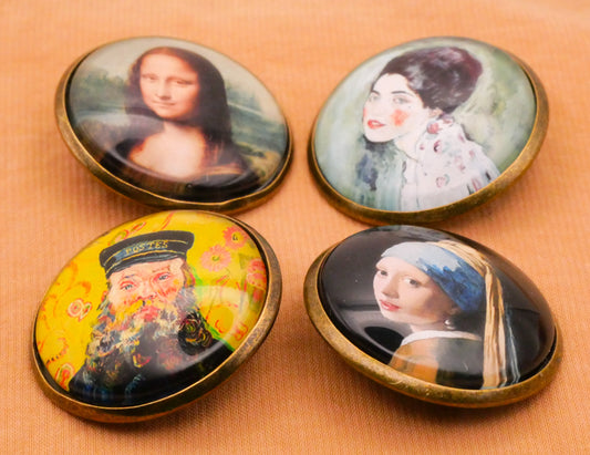 Artist Portraits Mona Lisa Klimt Girl with Pearl Earring Van Gogh Glass Dome Bronze Metal Button Various 28mm